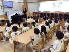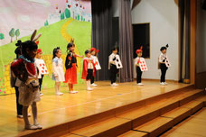 年少児は遊戯、年中児は舞踊劇、年長児は言語劇を発表します。学年が上がるにつれ、表現の幅が広がります。